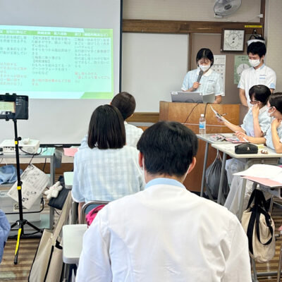 実際にミキサー食やキザミ食を栄養科の方に用意していただきました。患者さんがどのような食事をとっているのか、どのような配慮がされているのか体験しながらの学習でした。学生自身が患者さんの立場になることで気づけたことも多くあったようです。