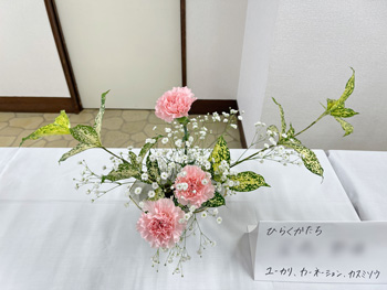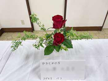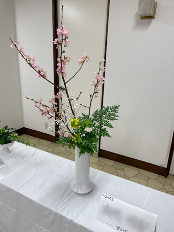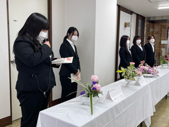 花材の扱い方、構成の考え方、季節感の表現などを丁寧に学んできました。発表会では、1年間の学びを生かし『ひらくかたち』『たてるかたち』など、学生それぞれが工夫を凝らした色とりどりの作品が並びました。教員や学生たちも、作品に込められた個性や成長を興味深く鑑賞していました。